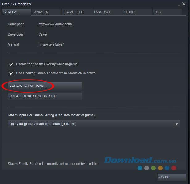 Ngay sau đó cửa sổ Dota 2 - Properties xuất hiện, tại đây hãy nhấn chọn đến phần Set launch option.