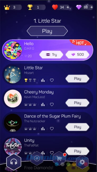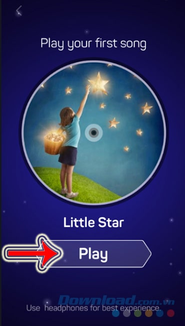 Tại giao diện đầu tiên của game mô phỏng này, chọn vào Play để bắt đầu vào chơi. Ngay trên nút này cũng chính là thử thách, là tên bài hát mà chúng ta sẽ chơi đầu tiên.