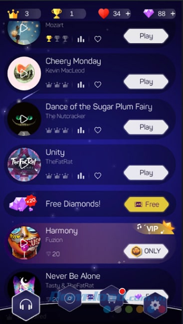 Một số bài có biểu tượng VIP thì không thể chơi nếu không đủ điều kiện. Ngoài ra, bạn cũng có thể xem quảng cáo để nhận thêm kim cương miễn phí - Free Diamonds!