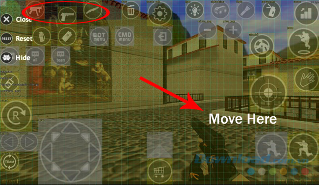 Bước 7: Đây là giao diện chính của game Half Life 1.6 trên Android, các bạn có thể thấy hơi rối, nhưng khi quen rồi sẽ thấy đỡ hơn. Giải thích qua một chút về những biểu tượng này (chúng ta chỉ chú ý và nói tới những biểu tượng chính, sẽ dùng tới để chơi game thôi nhé).