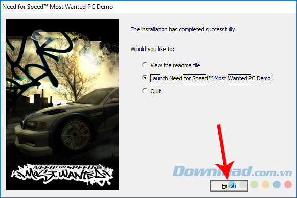 Sau khi cài đặt xong, bạn có thể thiết lập để thoát và chơi sau (Quit) hoặc chơi ngay (Launch Need for Speed Most Wanted) bằng cách tick chọn vào chúng.