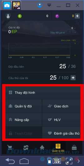 Bước 6: Đây chính là giao diện chính của đội bóng mà bạn đã chọn. Tại đây có thể thấy rất nhiều tùy chọn: