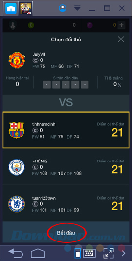 Một danh sách các đội bóng vừa tầm với bạn sẽ được hiển thị, chỉ cần click chuột trái vào đội bóng mà bạn muốn đối đầu rồi Bắt đầu để vào chơi.