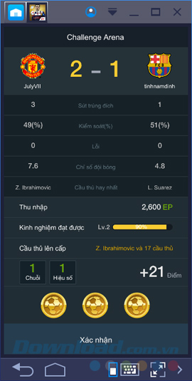 Sau khi kết thúc trận đấu, một bảng thống kê nhỏ sẽ xuất hiện, đồng thời bạn sẽ thấy số EP (điểm kinh nghiệm mà mình nhận được, level đội bóng cũng như cầu thủ nào được lên cấp. Chọn Xác nhận để đóng lại và quay trở lại Trang chủ để thi đấu tiếp.