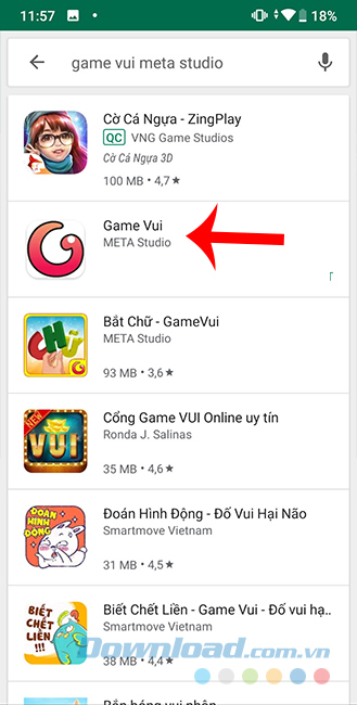 Khi kết quả hiện ra, chọn ứng dụng GameVui như hình dưới đây.
