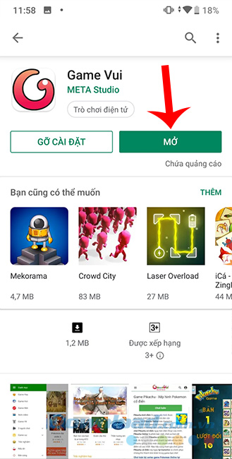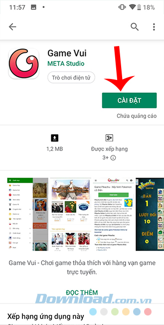 Bước 3: Chọn tiếp vào Cài đặt để bắt đầu. Ứng dụng khá nhẹ nên hầu như bạn không cần chờ đợi, chỉ mất vài giây là đã hoàn tất. Chạm vào Mở để khởi động ứng dụng GameVui trên di động ngay.