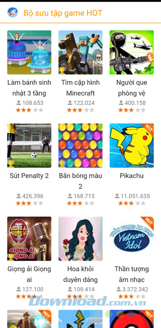 Các gợi ý, danh mục sắp xếp game trên GameVui