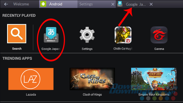 Bước 6: Lúc này chúng ta sẽ được đưa trở lại giao diện chính của giả lập BlueStacks. Click vào biểu tượng của Google Japanese hoặc chuyển sang tab tương ứng bên trên.
