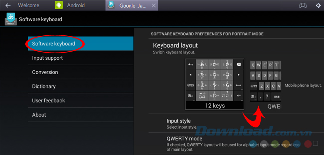 Nếu không quen hoặc muốn thử bàn phím khác, các bạn cũng truy cập vào Google Japanese, chọn Software keyboard, chọn tiếp loại bàn phím ở bên phải.