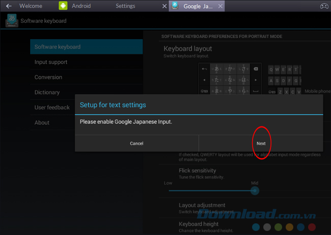 Bước 5: Một thông báo xuất hiện, các bạn chọn tiếp vào Next để kích hoạt ngôn ngữ này trên BlueStacks.
