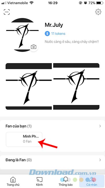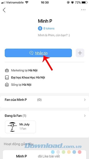 Bước 2: Quan sát trong mục Fan của bạn và chạm vào phần hiển thị tên của người mà bạn muốn chặn, giao diện chi tiết về tài khoản của họ hiện ra như dưới đây, bạn chạm tiếp vào Nhắn tin.