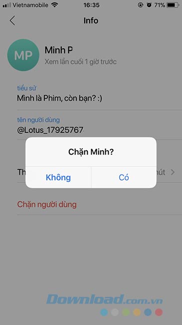 Chỉ cần chạm vào Chặn người dùng, chọn tiếp Có để xác nhận, khi muốn bỏ chặn họ, bạn cũng làm tương tự là được.