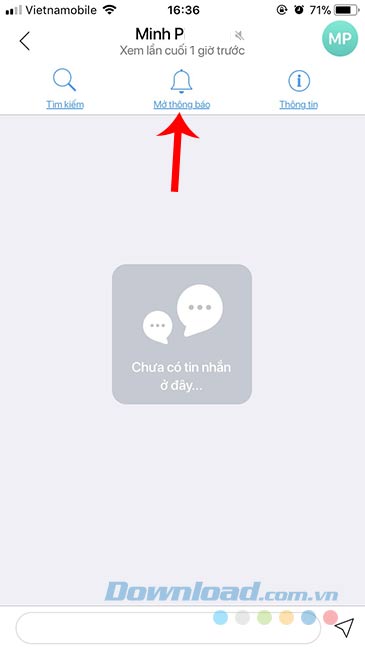 Khi muốn mở lại thông báo, bạn chỉ cần thực hiện tương tự và chạm lần nữa vào Mở thông báo. Tuy nhiên, nếu muốn sử dụng thêm nhiều tùy chọn khác, như chỉ muốn tắt thông báo trong một thời gian nhất định thì có thể chọn sang Thông tin.