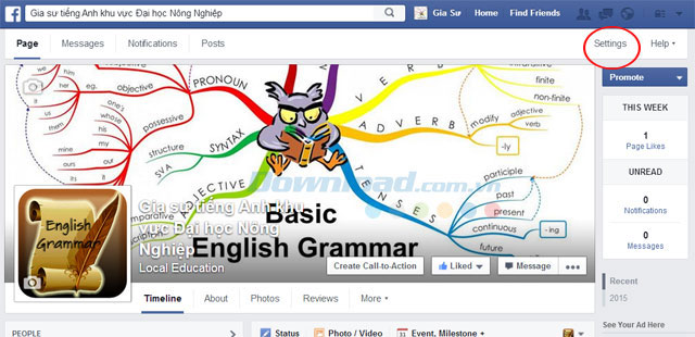 Trước tiên, bạn truy cập vào Fanpage Facebook của mình, rồi nhấp chuột vào Settings.
