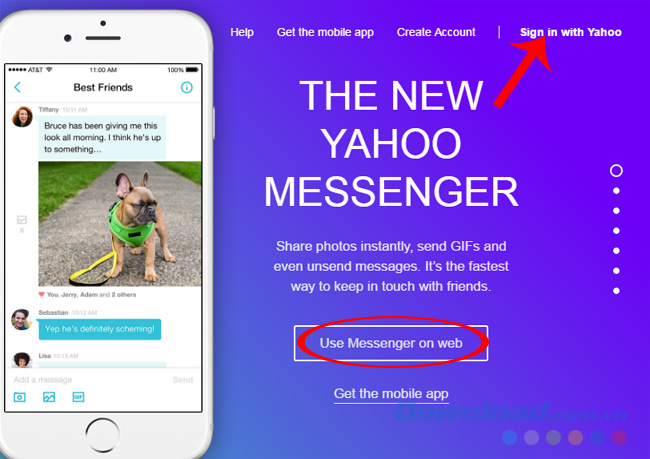 Bước 1: Sử dụng một trình duyệt web bất kỳ như Chrome, Firefox hay Opera, các bạn truy cập vào đường dẫn bên trên và nhấp vào Sign in with Yahoo (góc trên, bên phải) hoặc mục Use Messennger on web.