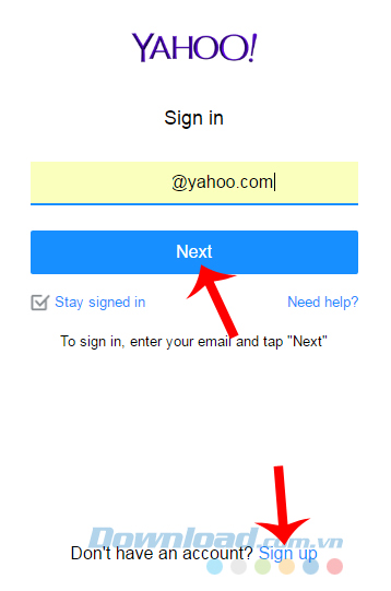 Bước 2: Tại giao diện mới, các bạn nhập thông tin tài khoản Yahoo của mình vào khung trống bên dưới rồi chọn tiếp vào Next. Còn nếu quên, mất tài khoản, có thể nhấp vào mục Sign Up ở phía dưới và thực hiện các bước để đăng ký lại tài khoản mới.
