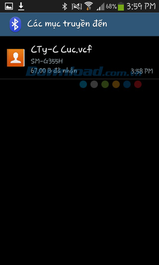 Bước 4: Lúc này trên thiết bị thứ 2 sẽ xuất hiện thông báo chuyển file, bạn hãy nhấn vào Chấp nhận để nhận danh bạ mà thiết bị 1 muốn chuyển qua. Sau đó, đợi 1 lát để thiết bị tải file về máy. Bạn sẽ thấy xuất hiện file vừa nhận ở mục Các mục truyền đến.