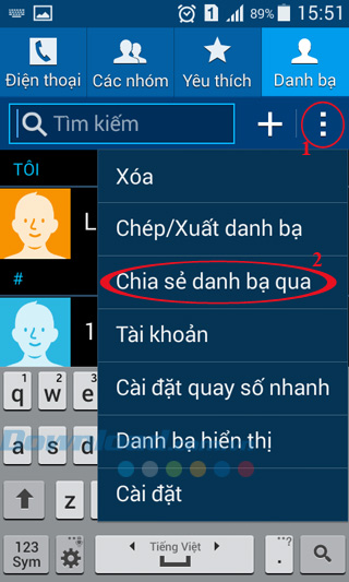 Bước 1: Đầu tiên hãy bật Bluetooth trên cả 2 thiết bị. Trên thiết bị muốn chia sẻ danh bạ thì nhấn chọn vào biểu tượng danh bạ trên màn hình chính. Sau đó, giao diện quản lý danh bạ xuất hiện, nhấn vào biểu tượng 3 chấm dọc (như trong hình) rồi chọn Chia sẻ danh bạ qua.