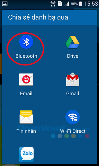 Bước 2: Gõ tên người muốn chia sẻ danh bạ vào ô tìm kiếm, tích vào ô chọn trước tên của người đó. Rồi nhấn vào Hoàn tất, sau đó chọn chia sẻ qua Bluetooth. Ngoài ra bạn có thể chia sẻ danh bạ qua Google Drive, Email, Gmail, tin nhắn, Wifi hay Zalo.
