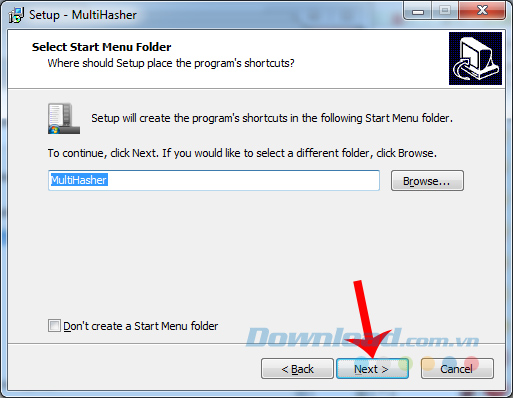 Bước 5: Chọn vị trí lưu bằng cách chuột trái vào Browse hoặc Next để cài đặt MultiHasher ngay tại vị trí đang được gợi ý.