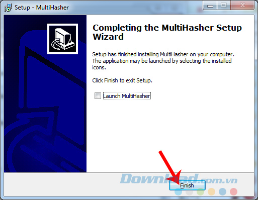 Khi quá trình cài đặt kết thúc, chọn vào Finish để đóng lại. Hoặc có thể tick vào Launch MultiHasher để chạy phần mềm này ngay khi cửa sổ đóng lại.