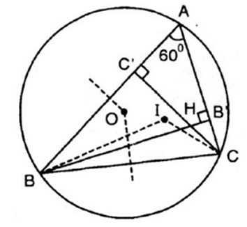 Ví dụ 1: Cho I, O lần lượt là tâm đường tròn nội tiếp, tâm đường tròn ngoại tiếp tam giác ABC với A = 60o. Gọi H là giao điểm của các đường cao BB' và CC'. Chứng minh các điểm B, C, O, H, I cùng thuộc một đường tròn.