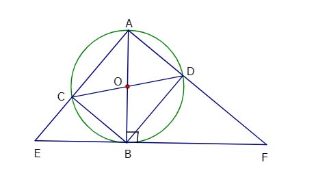 Ví dụ: Cho đường tròn (O; R) AB và CD là hai đường kính khác nhau của đường tròn. Tiếp tuyến tại B của đường tròn (O, R) cắt các đường thẳng AC, AD theo thứ tự tại E và F.