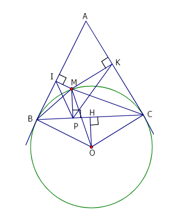 Ví dụ: Từ một điểm A nằm bên ngoài đường tròn (O; R) ta vẽ hai tiếp tuyến AB và AC với đường tròn (B, C) là tiếp điểm). Trên cung nhỏ BC lấy điểm M, vẽ MI vuông góc với AB, MK vuông góc với AC (I thuộc AB, K thuộc AC)