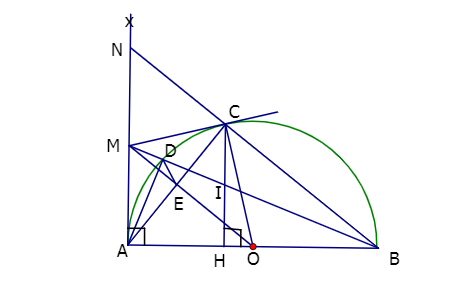 Ví dụ: Cho nửa đường tròn tâm O đường kính AB = 2R và tia tiếp tuyến Ax cùng phía với nửa đường tròn đối với AB. Từ điểm M trên Ax kẻ tiếp tuyến thứ hai MC với nửa đường tròn (C là tiếp điểm). AC cắt OM tại E, MB cắt nửa đường tròn (C) tại D (D khác B)
