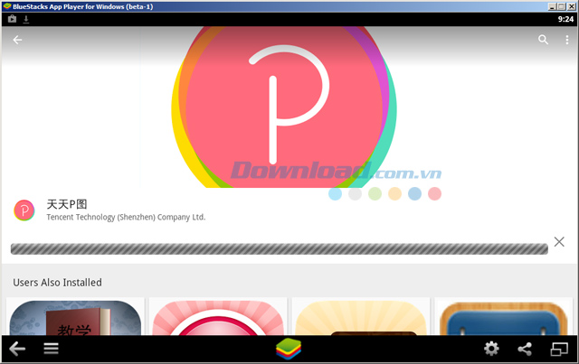Bước 8: Giao diện cài đặt ứng dụng Pitu trên máy ảo cũng tương tự như giao diện cài đặt trên smartphone sử dụng hệ điều hành Android. Bạn hãy đợi 1 lát để quá trình cài đặt hoàn tất để bắt đầu sử dụng PiTu tạo ảnh hiệu ứng Võ Tắc Thiên.
