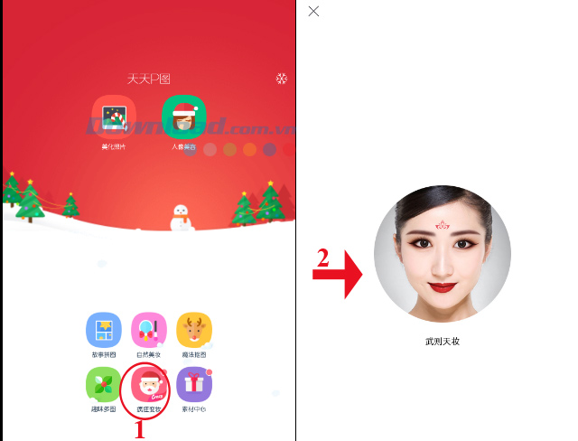 Bước 1: Nhấn chọnbiểu tượng ông già Noel được khoanh tròn màu đỏ như trong hình dưới để chụp ảnh theo phong cách Võ Tắc Thiên trên máy tính. Sau đó, sẽ cho phép bạn chọn các tạo hình khác nhau, ở đây có rất nhiều mẫu khác nhau cho bạn lựa chọn. Hãy chọn tới biểu tượng Võ Tắc Thiên mà bạn yêu thích nhất.