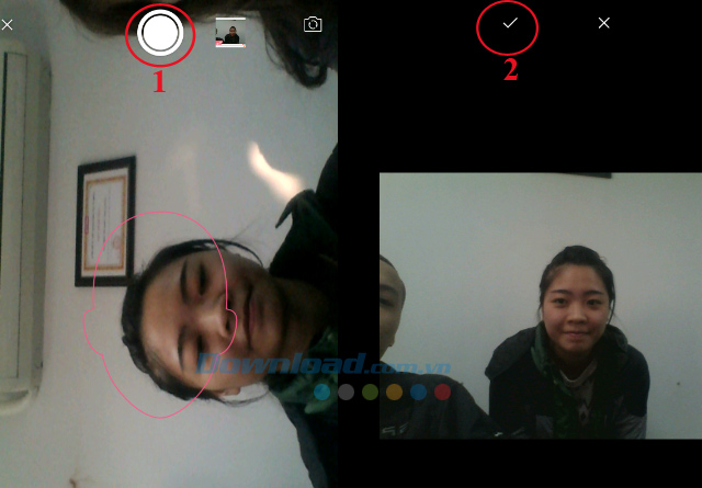 Bước 2: Cửa sổ chụp ảnh xuất hiện, bạn có thể chụp hình theo phong cách Võ Tắc Thiên. Lưu ý, chụp ảnh khuôn mặt khớp với đường hướng dẫn trên màn hình camera, giao diện chụp ảnh trên máy tính ban đầu nhìn có vẻ hơi ngược nhưng không sao cả bạn cứ tiến hành chụp bình thường. Sau khi tạo hình ưng ý thì nhấn vào biểu tượng chụp ảnh ở góc trên cùng màn hình (khoanh tròn màu đỏ như trong ảnh dưới), rồi nhấn vào biểu tượng dấu tích chọn để lưu lại ảnh chụp.