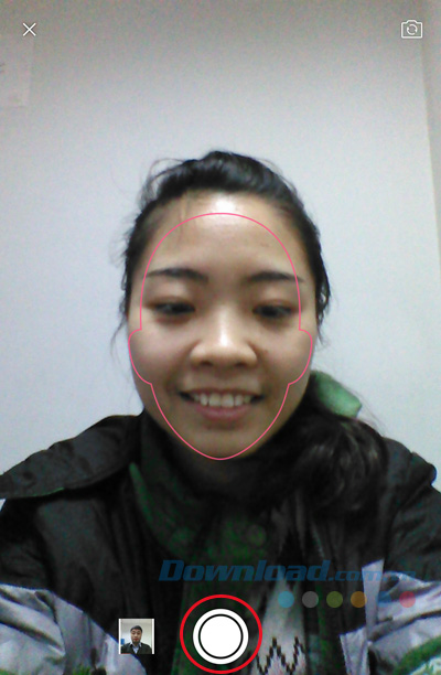 Bước 3: Cửa sổ chụp ảnh xuất hiện. Bạn có thể chọn ảnh từ thư viện trong thiết bị bằng cách bấm vào biểu tượng ảnh thu nhỏ phía dưới màn hình hoặc chụp trực tiếp bằng cả camera trước hoặc sau. Lưu ý, chụp ảnh khuôn mặt khớp với đường hướng dẫn trên màn hình camera, Pitu có khả năng nhận diện khuôn mặt rất tốt. Sau khi tạo hình ưng ý thì nhấn vào biểu tượng chụp ảnh ở góc dưới cùng màn hình (khoanh tròn màu đỏ như trong ảnh dưới).