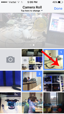 Bước 4: Sau khi đã có ảnh 360, các bạn truy cập vào tài khoản Facebook của mình và chọn ảnh đăng lên như bình thường. Các ảnh được chụp và xếp là ảnh 360 sẽ có thêm biểu tượng quả cầu tròn bên dưới.