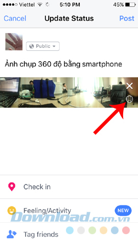 Bước 5: Làm các thao tác như khi đăng một tấm ảnh bình thường trên Facebook, khi xem lại chúng ta sẽ thấy trên bức ảnh có thêm "đặc điểm nhận dạng". Lắc, nghiêng hoặc xoay điện thoại theo các hướng khác nhau để xem toàn bộ ảnh này.