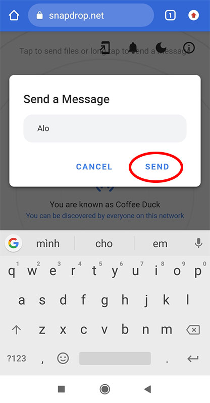Ngoài việc gửi file, người dùng còn có thể gửi tin nhắn cho các thiết bị đang sử dụng snapdrop bằng cách nhấn giữ vào tên thiết bị đó. Đánh lời nhắn vào ô trống sau đó nhấn Send.
