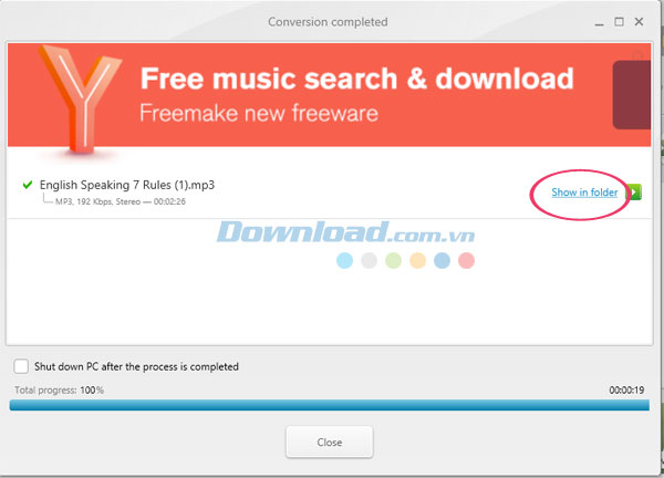 Lúc này, bạn có thể mở file MP3 đầu ra bằng cách nhấp chuột vào nút Show in Folder.