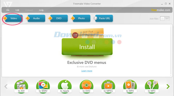 Sau khi tải và cài đặt Freemake Video Converter về máy tính (có thể tham khảo hướng dẫn cài đặt chương trình tại đây), bạn sẽ nhìn thấy giao diện của chương trình như bên dưới: