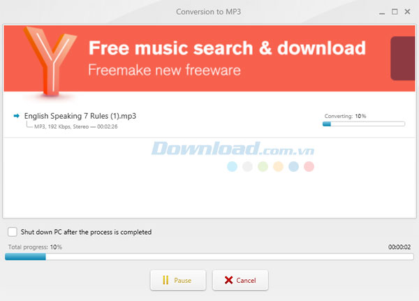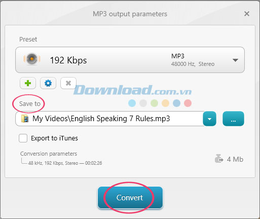 Một cửa sổ nhỏ sẽ hiển thị để cho phép người dùng tùy chỉnh các thông số đầu ra của file MP3. Bạn có thể chọn thư mục để lưu lại tập tin đầu ra trong ô Save to. Thư mục mặc định sẽ là: C:\Users\User\Videos\English Speaking 7 Rules.mp3. Ngoài ra, được phép lựa chọn thư mục khác trong máy tính nếu muốn. Sau đó, nhấn nút Convert để bắt đầu chuyển đổi.