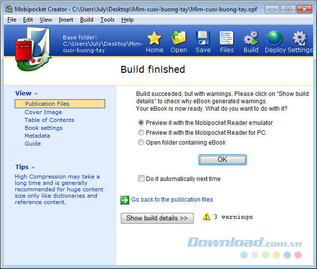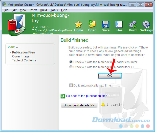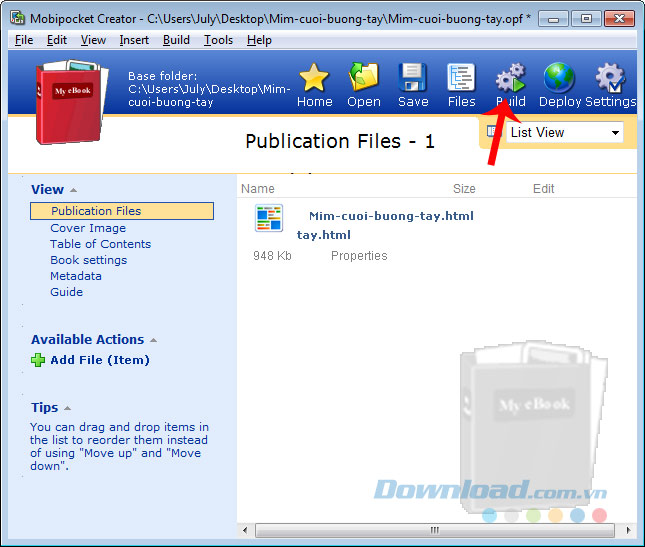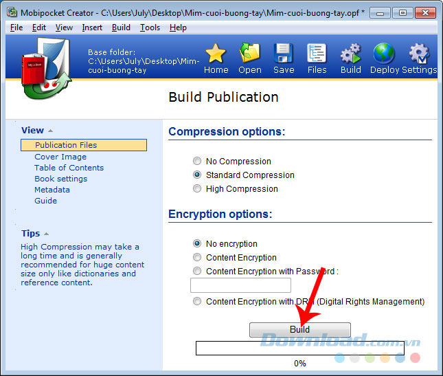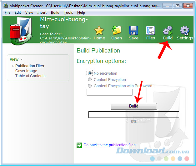 Bước 3: Sau khi chạy xong, giao diện mới của Mobipocket Creator sẽ có dạng như dưới đây, các bạn nhấp vào Build ở trên thanh Menu và bên dưới để tiếp tục.
