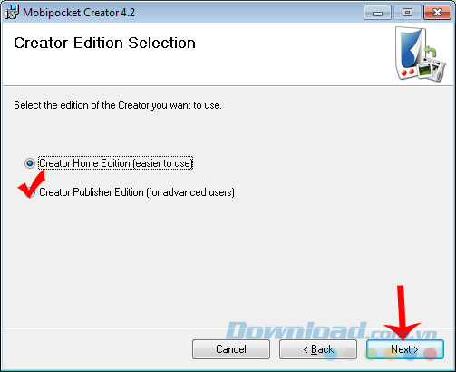 Bước 3: Đây là bước khá quan trọng, bởi Mobipocket Creator có hai phiên bản: