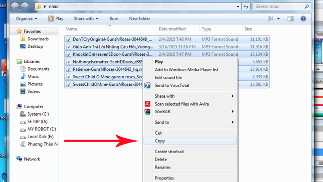 Tìm thư mục chứa các tập tin âm nhạc bạn lưu trữ trong máy tính. Chọn các bài hát yêu thích và chọn Copy.