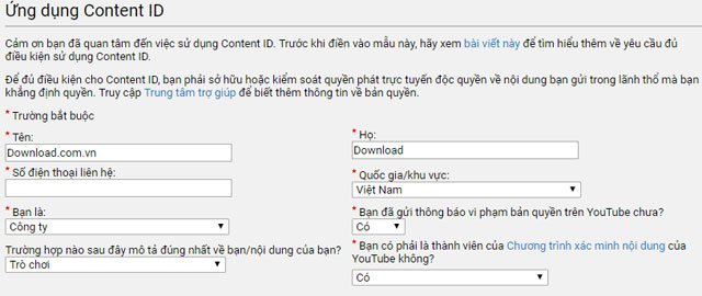 Tại giao diện chính Ứng dụng content ID chúng ta sẽ phải điền các thông tin cá nhân cơ bản như: tên, số điện thoại, trang web, quốc gia, vv.