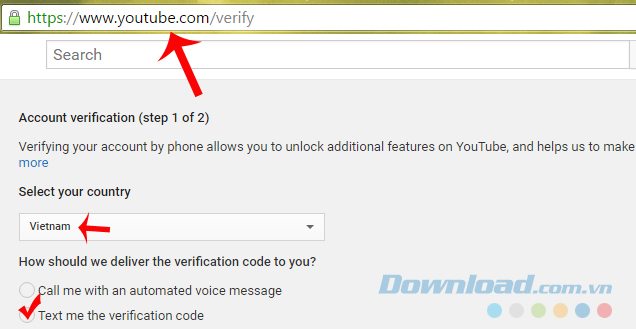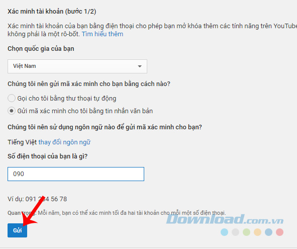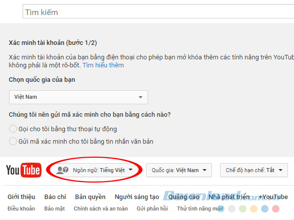 Ở bước xác minh tài khoản đầu tiên, các bạn chọn Quốc gia và chọn cách muốn nhận được mã xác minh từ Youtube.