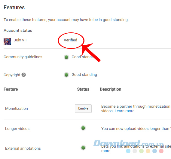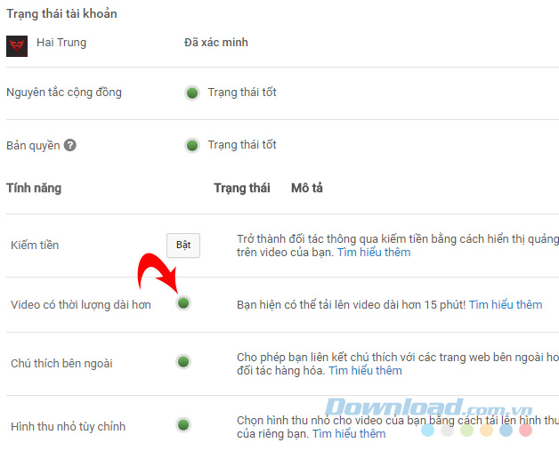 Một giao diện tương tự như ở bước 2 xuất hiện, kiểm tra sẽ thấy tài khoản Đã xác mình, phần Video có thời lượng dài hơn - Longer videos cũng đã được tick dấu tròn xanh (có thể up được video có thời lượng dài hơn 15 phút).