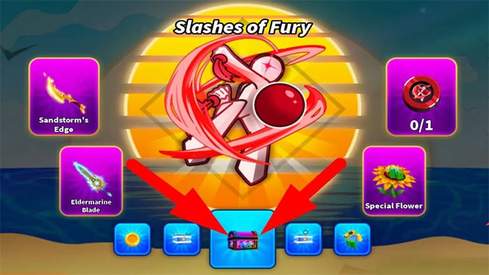 Để mở khóa Slashes of Fury, chúng ta có thể kiếm được 400 Shells cho mỗi lần quay hoặc có thể bỏ qua yêu cầu về Shells bằng cách mua lượt quay bằng Robux. Chi phí là 79 Robux cho một lượt quay hoặc 639 Robux cho 10 lượt quay. Khi có đủ Shells hoặc Robux cần thiết, bạn có thể quay vòng quay Tropical Spin, bao gồm hai giai đoạn: vòng quay cơ bản và vòng quay sử thi. Tất cả người chơi đều bắt đầu bằng vòng quay cơ bản.