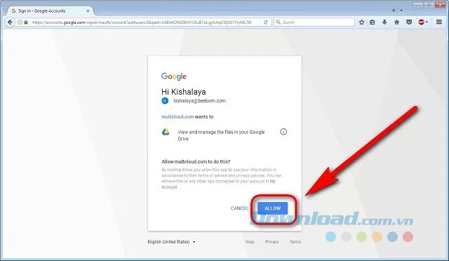 Click vào Allow để xác nhận rằng bạn muốn MultCloud truy cập vào tài khoản của mình.