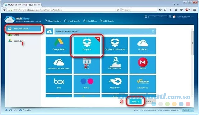 Chọn bất cứ dịch vụ đám mây nào bạn cần và click vào Next. Bài viết sử dụng Google Drive và Dropbox.