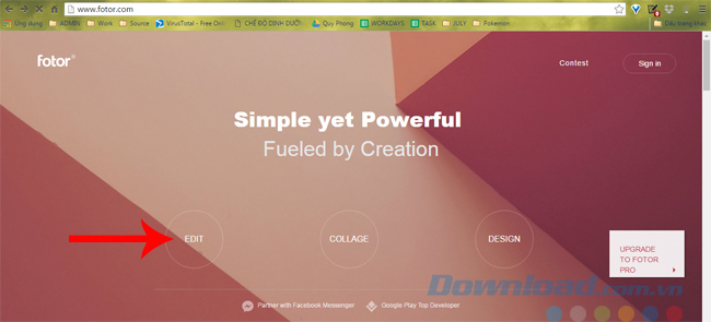 Bước 1: Các bạn truy cập vào đường dẫn này để được chuyển tới trang chủ của Fotor online.Từ giao diện chính của trang, chọn vào Edit.