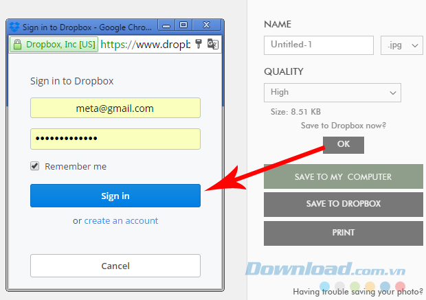 Còn nếu muốn lưu lên dịch vụ lưu trữ trực tuyến thì chọn vào OK rồi đăng nhập tài khoản Dropbox của mình.